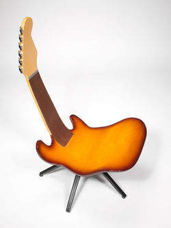 The first design in the Metz Functional Art line. Individually handcrafted out of six layers of Baltic Birch, it can be constructed to resemble any style of guitar and finished in any color. The chair rests comfortably on a five leg steel base, which rocks and swivels 360 degrees.